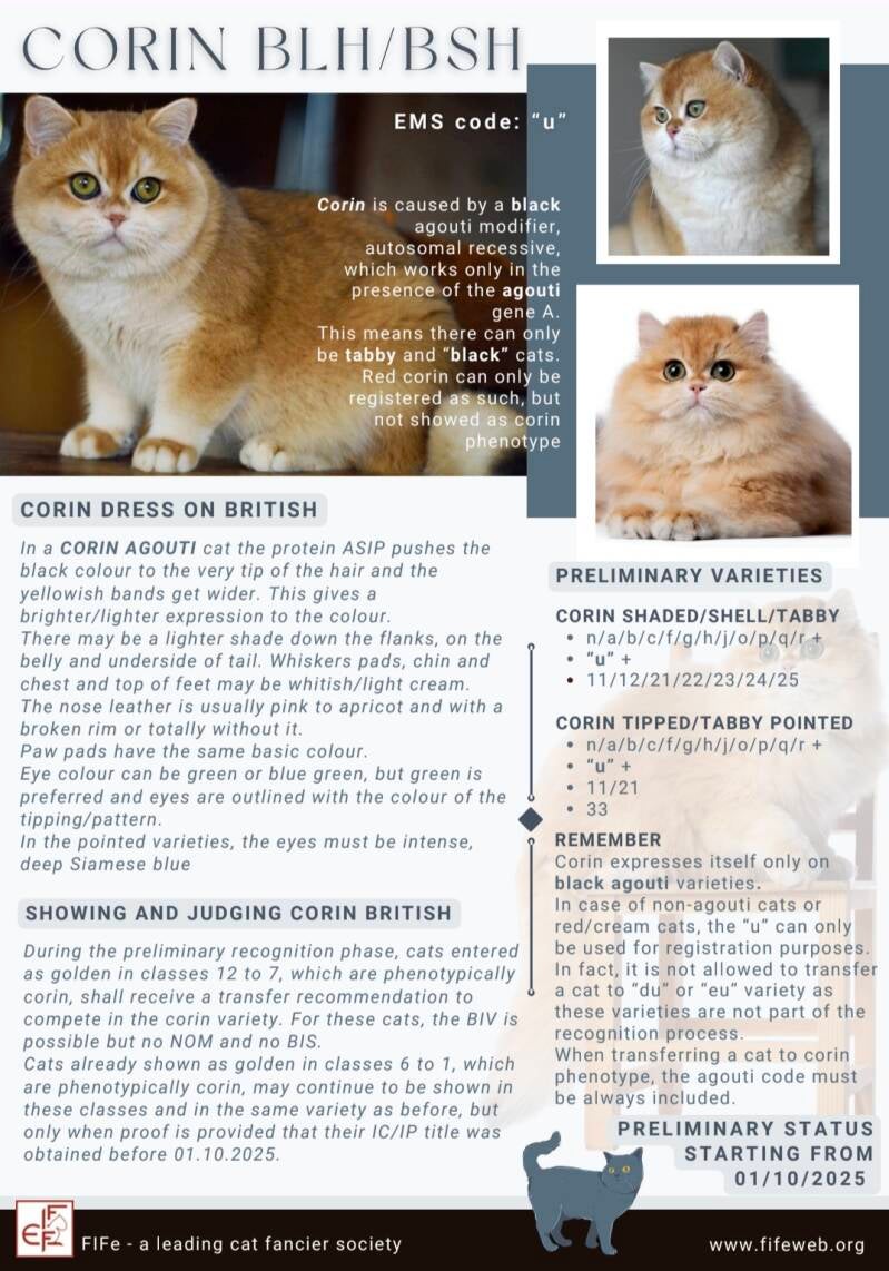 Vuoden 2025 loppupuolella Corin värillään hyväksyttiin alustavasti FiFe:ssä, toivottavasti täysi hyväksyntä saavutetaan pian. Keskitymme jatkossa myös tähän väritykseen tipping kissoillamme. Corin väri on lähellä kultaa, mutta lämpimämpi ja tämä voi yhdistyä mm. siniseen tai mustaan, joita kasvatamme
